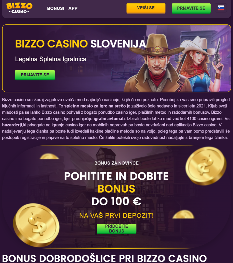 Recenzija je namenjena igralcem iz Slovenije. Bizzo Casino izstopa z lokalizirano podporo slovenskega jezika, prilagojenimi plačilnimi metodami in zanimivimi bonusi, ki so posebej ugodni za slovenske igralce.