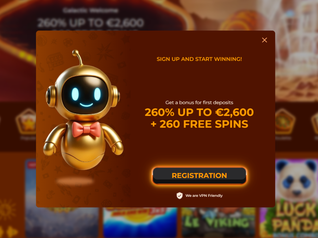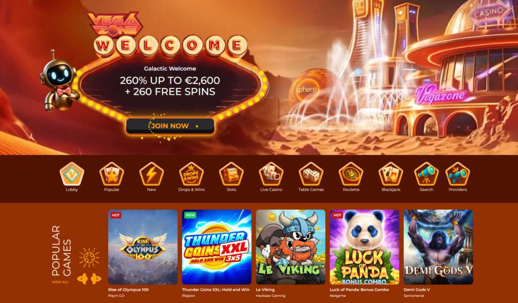260 % do 2.600 € in 260 brezplačnih vrtljajev je prva stvar, ki vas pozdravi ob obisku Vegazone Casino igralnice. Že na prvi pogled je jasno, da gre za vesoljsko tematsko zasnovo, kjer igralce v svet slotov, bonusov in promocij popelje prijazen robot. V ozadju se bleščijo futuristične zgradbe, kar ustvari občutek igre na drugem planetu — dobesedno in v prenesenem pomenu.