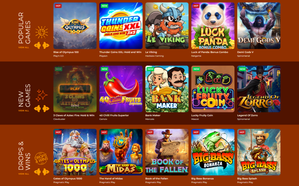 V ponudbi je več sto iger, med katerimi izstopajo znane uspešnice kot so Sweet Bonanza, Gates of Olympus, Book of the Fallen in Big Bass Bonanza. Igre prihajajo od vrhunskih ponudnikov, med njimi Pragmatic Play, Play’n GO, NetEnt in Relax Gaming, kar zagotavlja raznolikost tem in visoko kakovost animacij.